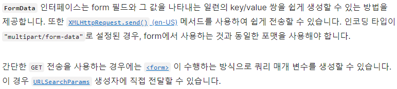 참고 : https://developer.mozilla.org/ko/docs/Web/API/FormData