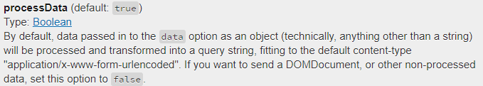 기본적으로 data 파라미터에 들어간 데이터들은 기본 타입인 "application/x-www-form-urlencoded"에 맞게 쿼리 문자열로 변환된다고 한다. 그래서 DOM 문서나 처리되지 않은 데이터를 보내려면 false로 해야한다고 써있다.