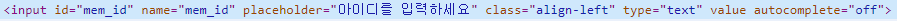 <form:input path="mem_id" class = "align-left" autocomplete="off" placeholder = "아이디를 입력하세요"/>