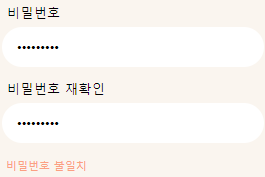 이렇게 하면 JS에서의 처리만으로 가입자의 비밀번호 입력 및 재확인 일치여부, 패턴 검증까지 완료되었다고 할 수 있다.