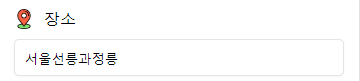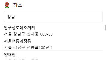 선택 결과 지금은 장소명만 가지고왔지만 다른 <input> 태그를 hidden으로 해두고 주소도 저장하여 폼이 전송될 때 주소도 같이 넘겨줄 수 있겠다.
