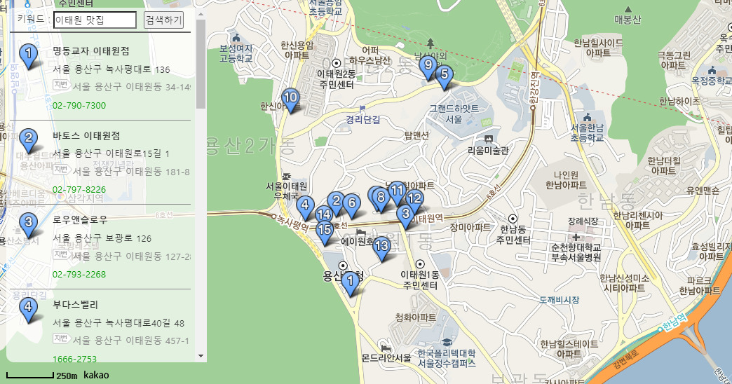 중요한건 <input> 태그의 id인 "keyword"와 아래 검색 목록이 위치하게 될 <ul> 태그의 id인 "placeList"가 되겠다.