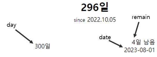 이렇게 해서 기준일로부터 오늘까지 지난 일 수, 기준일로부터 특정 날짜까지 남은 일 수와 날짜를 구해봤다.