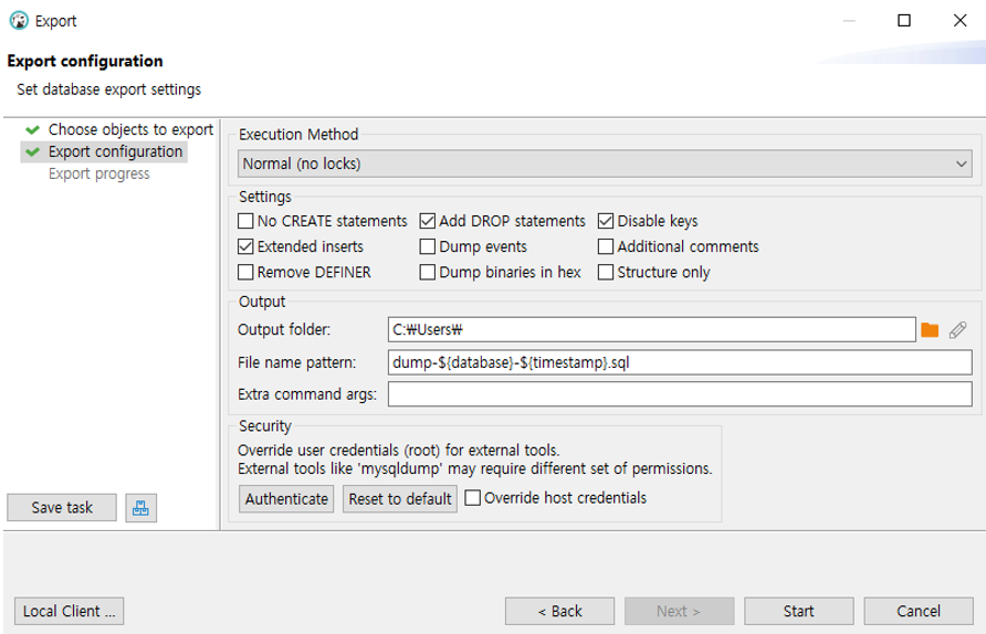 Dump database-2 뭔지 잘 몰라서 기본설정으로 두고 경로만 정해준뒤 Start를 눌러줬다.