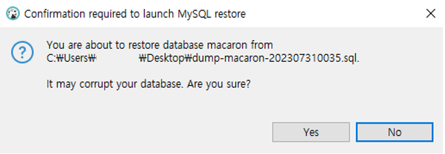 Restore database-2 이런 메시지가 뜨는데 어차피 DB는 새로 생성해서 비어있으므로 Yes를 해줬다.