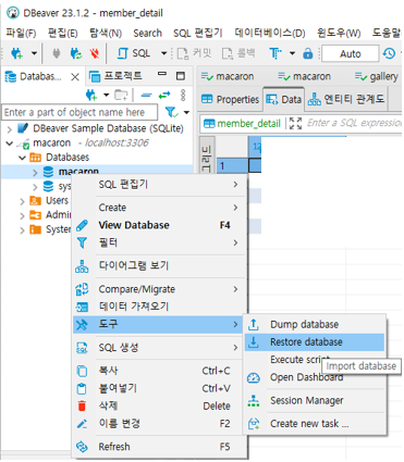 해당 DB 우클릭 - 도구 - Restore database 순으로 클릭한다.