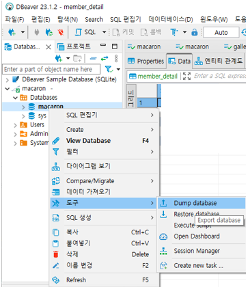먼저 DBeaver를 열고 내보낼 DB 우클릭 - 도구 - Dump database 순으로 클릭한다.