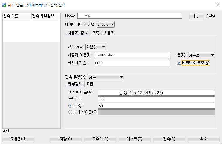 여기서는 오라클DB에 접근하는 방법을 적고 있으므로 오라클 포트 번호인 1521로 해줬다.