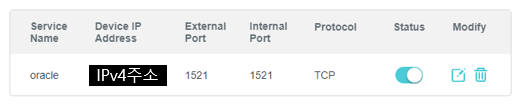 외부에서 공유기의 1521 포트로 접근하면 위에 설정한 디바이스의 1521포트로 연결해주는 뭐 그런 걸로 보면 될 것 같다.